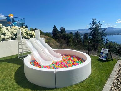 Fifteen foot custom designed balloon garland in colours of your choice (up to 3 colours). Up to two marquee numbers for the celebrated age. Includes our largest bounce house, the cloud nine slide and our dual slide into ball pit. Delivered, styled and taken down in Kelowna or West Kelowna. Services in other areas of the Okanagan will be billed out as an additional fee.